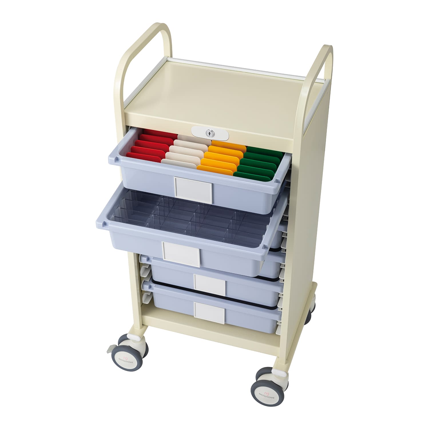 ●シリンダー錠の施錠で全てのトレーに鍵がかかるコンパクトタイプの救急カートです。