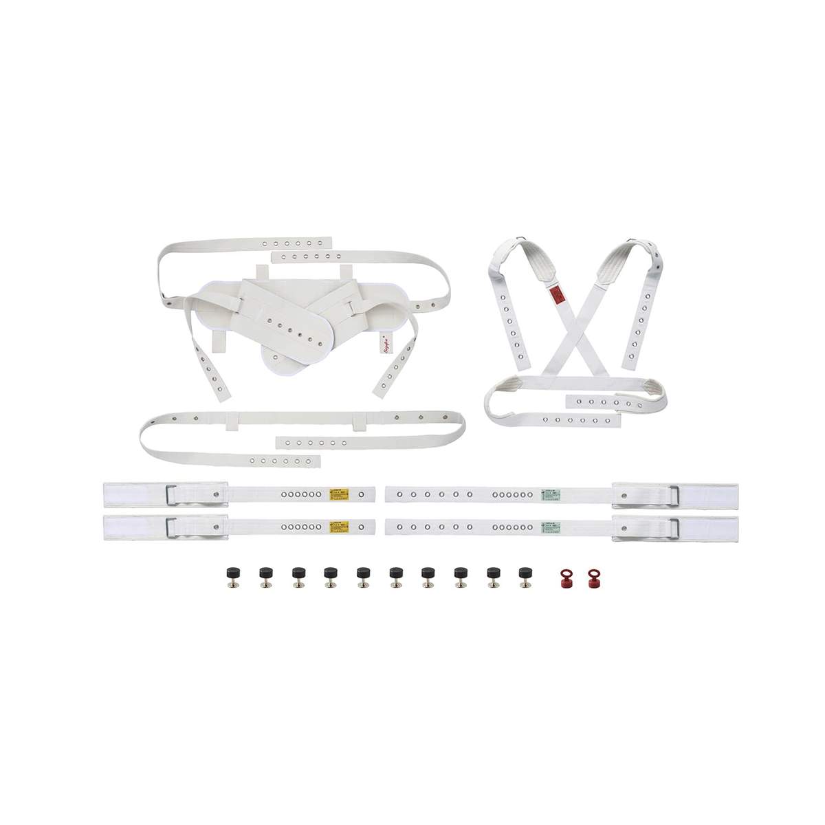 ●「セグフィックス保護ベルト」シリーズの基本となる腹部用ベルトをはじめ、上半身用ベルト、手用ベルト、足用ベルト、足用取付ベルトとボタン・ピン・キーのロックシステムのセットです。