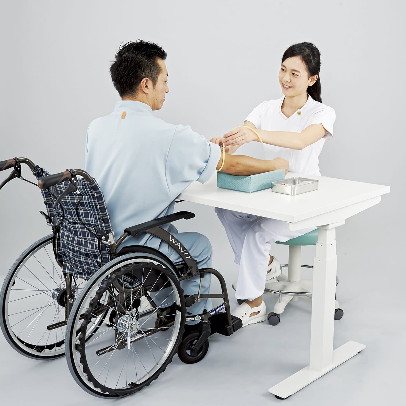 ●無段階に調節でき、処置テーブルとして車いすにも即対応できます。