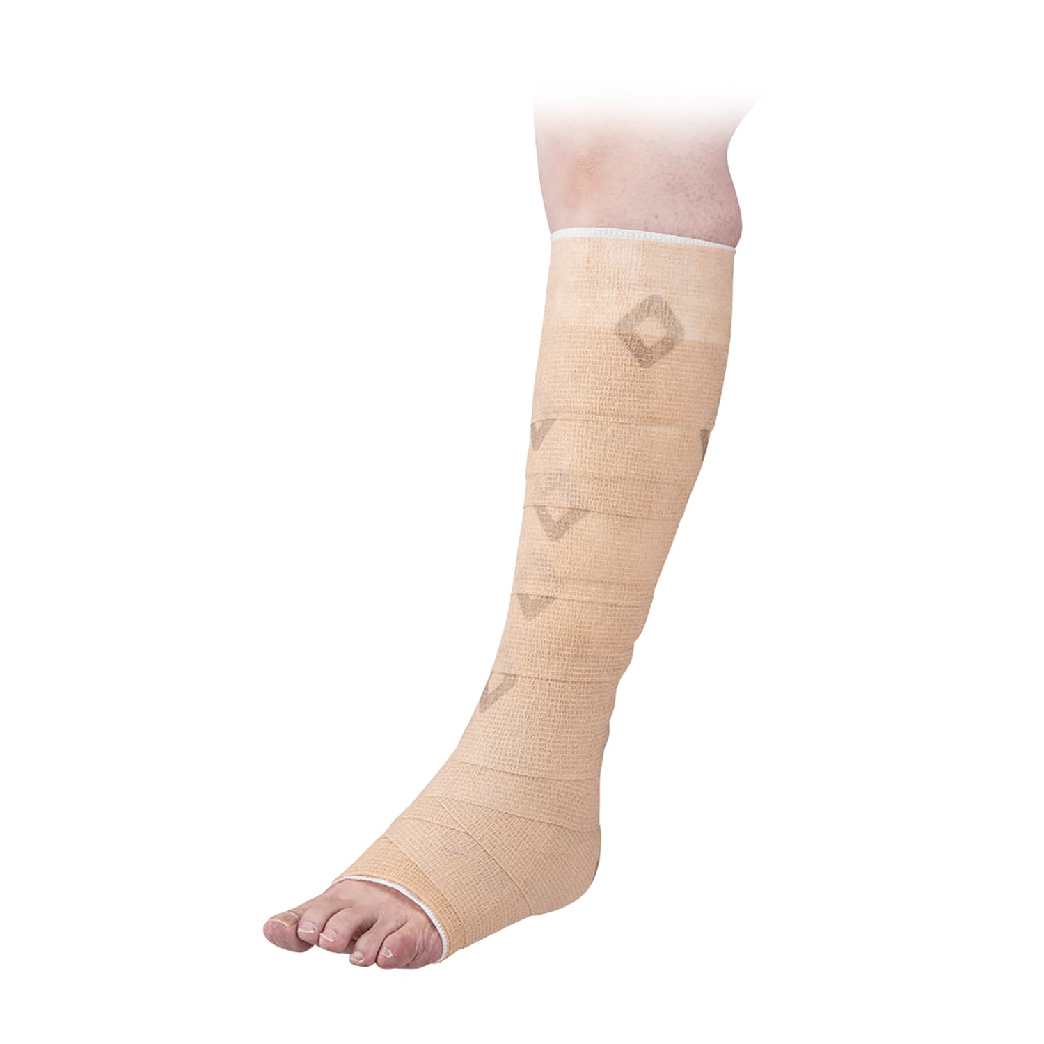 ●インナーに片面自着性・弾性糸を用いたショートストレッチのパディング包帯、アウターに両面自着性のロングストレッチのガイド付き弾性包帯を巻きつけ、ズレ・緩みのない安定した圧迫を行います。