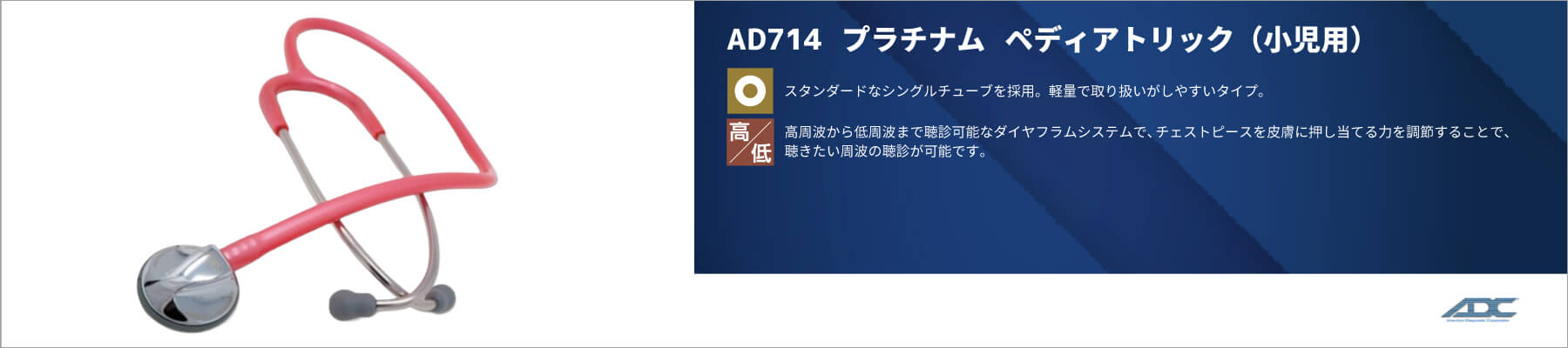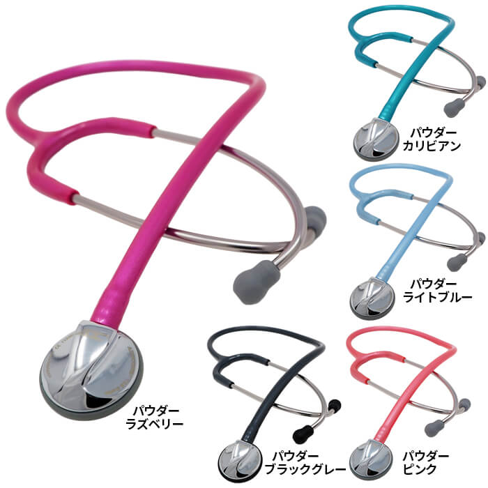 ADC独自の音響特性に優れたプラチナムチェストピース。押さえ方の強弱で高周波音/低周波音を連続で聴診可能なサスペンデッドダイアフラム。スナップオンタイプの新型イヤーチップ。