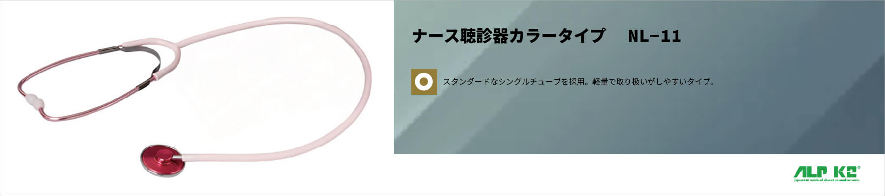 医療現場で看護師さん(ナース)が日常的に使うことを想定して作られた軽量でシンプルな聴診器。血圧測定時のカフに挟みやすいシングルヘッドを採用。NL-12のカラーバージョン。