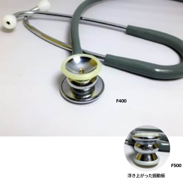 これらの聴診器の最大の特長は振動板の形状にあります。この振動板は、特別の素材の積層板を使用し、そして、振動板を固定するリングの上に浮き上がるように成型してあります。これによって振動板には、最適の張力が与えられ、最高の聴音効果が得られます。