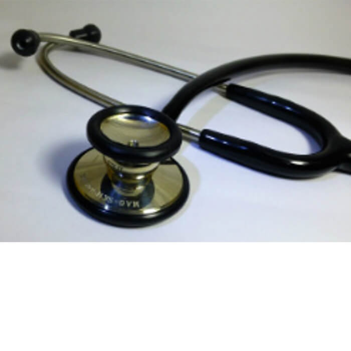 銀と同等の質感、比重、光沢があり雑音等を吸収する高級素材の洋銀(ジャーマンシルバー)を胸当て部全てに採用している為、手、布等の摩擦音を抑える事が可能であり、又、今までの聴診器には無かった光沢質感が得られます。