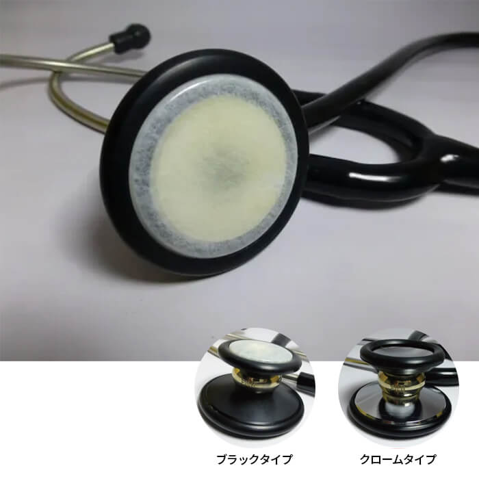 スタンダードタイプ集音部のダイヤフラムは、特別素材の積層板を、プラスチック製固定リングよりも浮き上がる状態に成型してあります。フランジ(大)の内部には、特殊ラバーを取り付ける事によって、普通の状態で聴診した時と、強く押し当てて聴診した時に2種類の周波数が異なる音を聴診できるように設計してあります。