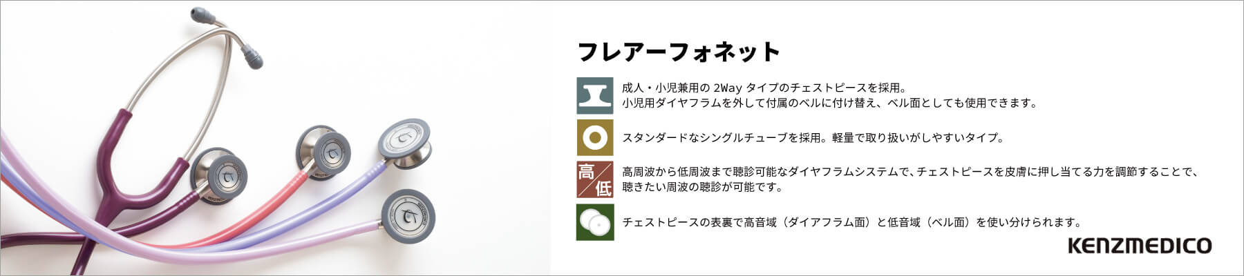 成人用と小児用のサスペンデッド型ダイアフラムを両面に標準装備。サスペンデッド型ダイアフラムとスタンダード型ダイアフラムが交換可能。小児用面はダイアフラム面からベル面に変換可能。