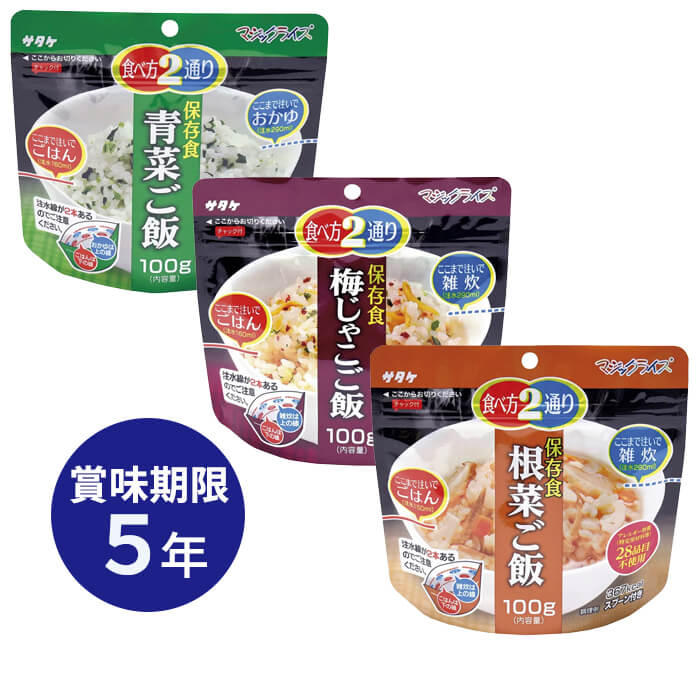 7年間の長期保存が可能です。調理器具が無くても熱湯の場合7分、水(20℃)の場合40分で30人分のご飯のご用意が可能です。