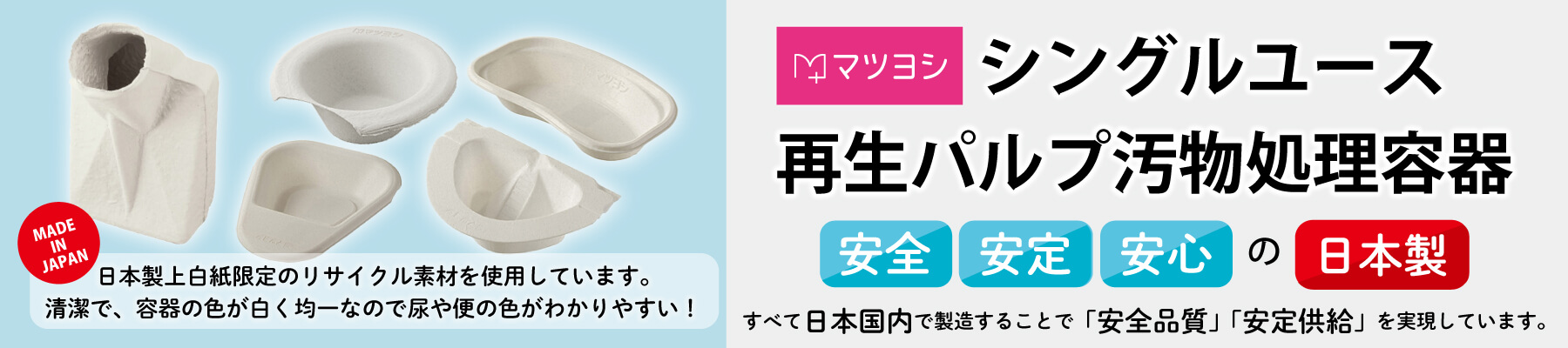 ⌂ HOME 特集ページ シングルユース再生パルプ汚物処理容器 シングルユース再生パルプ汚物処理容器 立てても使用可能な尿器です。 マツヨシ シングルユース尿器(40コ入り) ¥5,500(税抜) ポータブルトイレ用バケツの用途に。 マツヨシ シングルユース便器(100コ入り) ¥17,150(税抜) 洗面器・ガーグルベースンの用途に。 マツヨシ シングルユースボール(160コ入り) ¥8,250(税抜) 差込便器・ベッドパンの用途に。 マツヨシ シングルユース差込便器(80コ入り) ¥8,450(税抜) ユーリンパンの用途に。 マツヨシ シングルユース尿取りハット(60コ入り) ¥6,200(税抜) 膿盆・パットの用途に。 マツヨシ シングルユース膿盆(360コ入り) ¥15,500(税抜) ポータブルトイレ用バケツの用途に。 マツヨシ シングルユース深型便器(50コ入り) ¥9,700(税抜) 洗面器・ガーグルベースンの用途に。 マツヨシ シングルユース深型ボール(100コ入り) ¥8,000(税抜) シングルユース深型ボール用のフタです。運搬時のハネによる汚れ・においや菌の飛散を防止します。 マツヨシ シングルユース深型ボール用フタ(50コ入り) ¥1,500(税抜) シングルユース便器用のフタです。運搬時のハネによる汚れ・においや菌の飛散を防止します。 マツヨシ シングルユース便器用フタ(250コ入り) ¥11,000(税抜) シングルユース深型便器用のフタです。運搬時のハネによる汚れ・においや菌の飛散を防止します。 マツヨシ シングルユース深型便器用フタ(200コ入り) ¥11,600(税抜) シングルユース尿器専用ホルダーです。 シングルユース尿器用ホルダー ¥3,600(税抜) シングルユース便器専用ラックです。 シングルユース便器用ホルダー ¥19,500(税抜) シングルユースボール専用ラックです。 シングルユースボール用ラック ¥22,400(税抜) マセレーター粉砕専用のおしりふきです。 マツヨシ 介護用おしりふき ¥630(税抜) マセレーター専用洗浄剤です。 セーフガード24 ¥32,200(税抜)